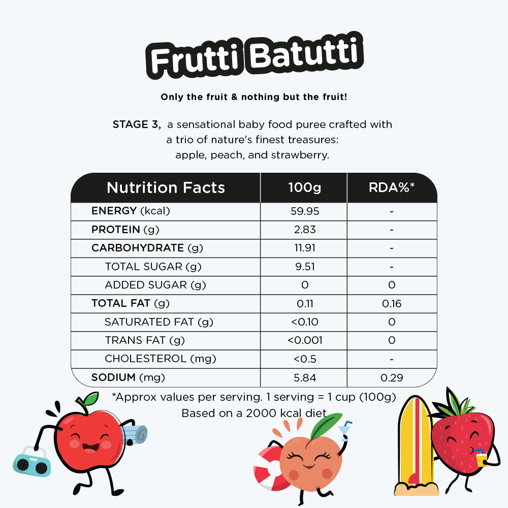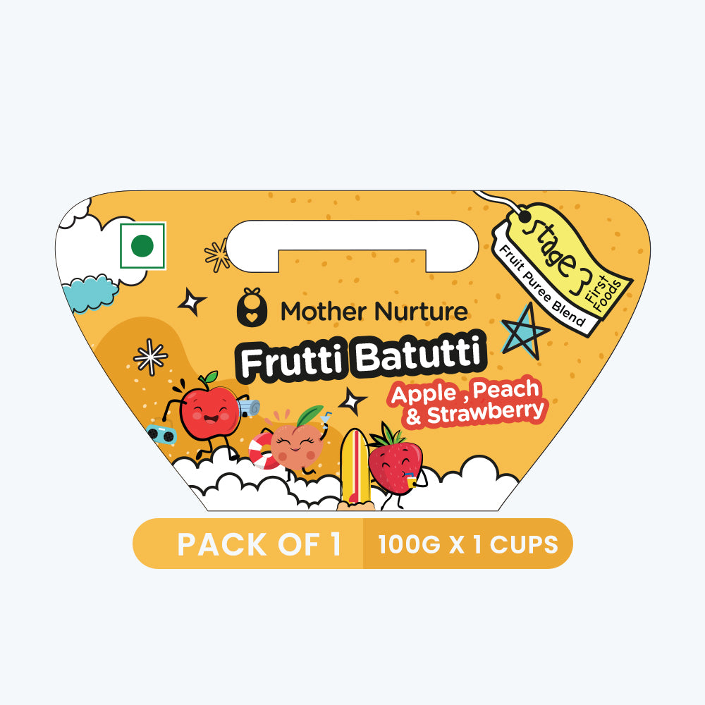 Introducing "Frutti Batutti" by Mother Nurture — a sensational baby food puree crafted with a trio of nature's finest treasures: apple, peach, and strawberry. This delectable blend is designed to delight your baby's taste buds while providing essential nutrients for their growth and development.