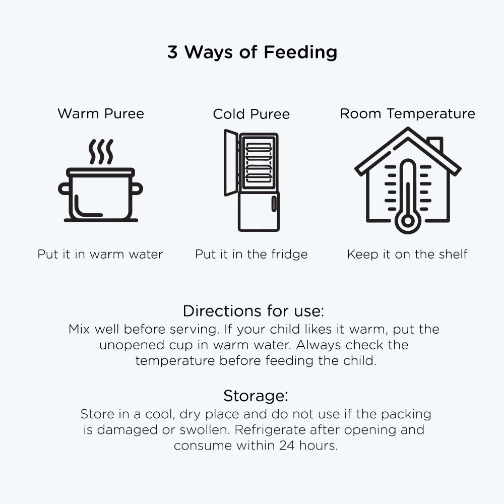 Directions for use: Mix well before serving. If your child likes it warm, put the unopened cup in warm water. Always check the temperature before feeding the child.
