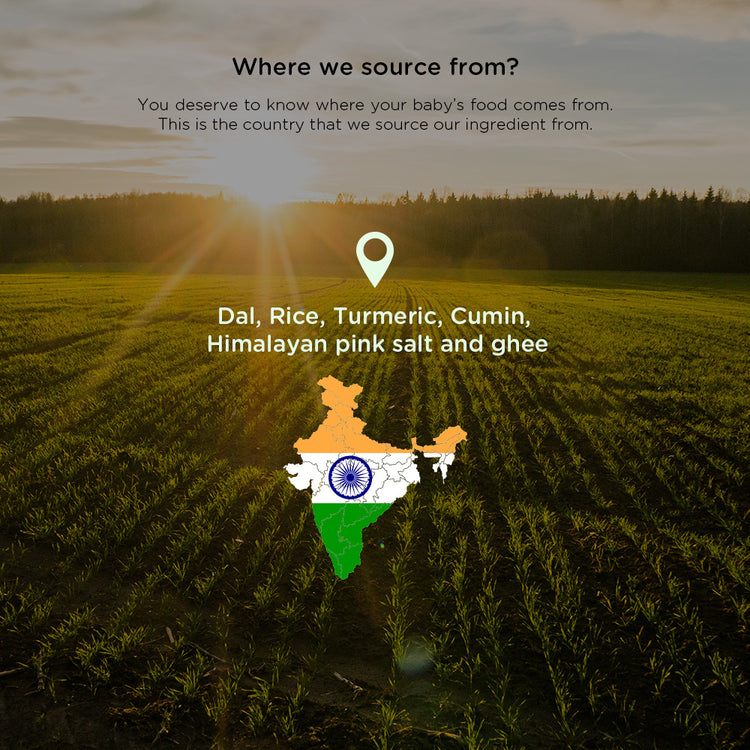 Stage 3 – 9+ Month Babies: This healthy and delicious dal khichdi is the ideal first food for your child. The smooth dal, rice, turmeric, cumin, himalayan pink salt and ghee is easy to feed to Baby, and has the perfect texture to be easily accepted by your little one.