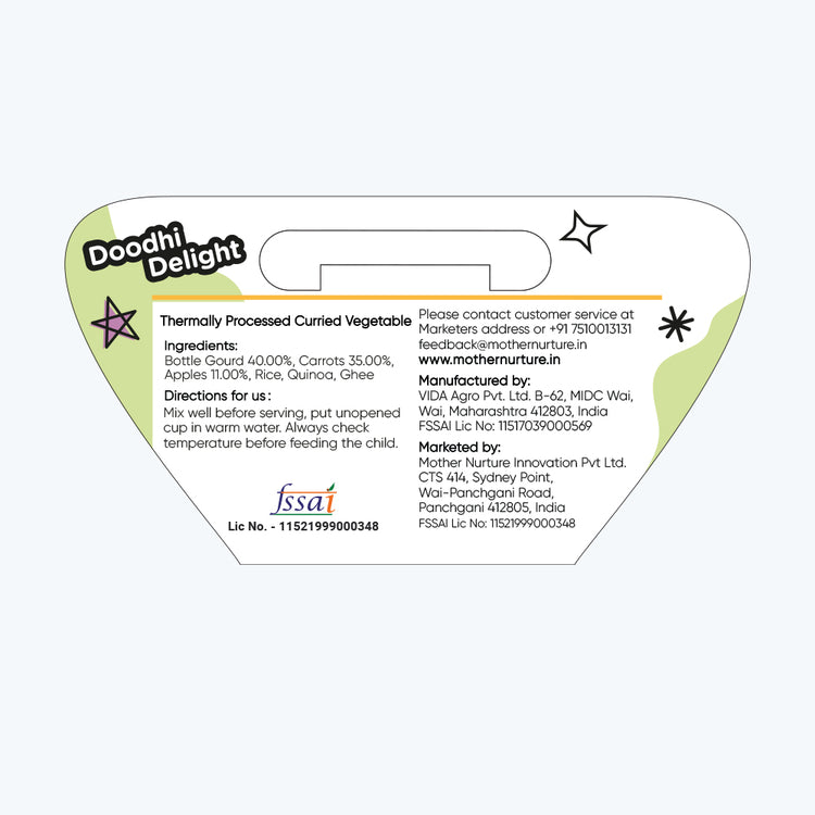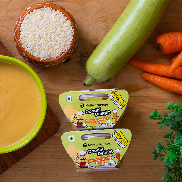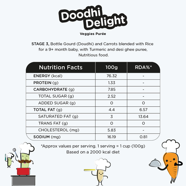 Healthy Bottle Gourd (Doudhi), Carrots, Apple Puree blended with Rice and Quinoa makes a nutritious Stage 3 meal. It has the perfect taste and texture to appeal to your child's palate and is enriched with a dash of Ghee.